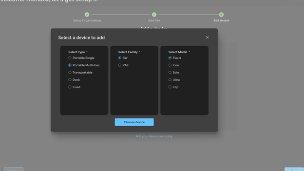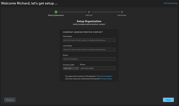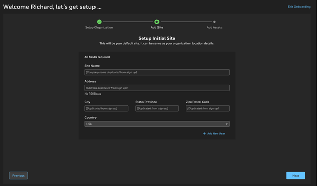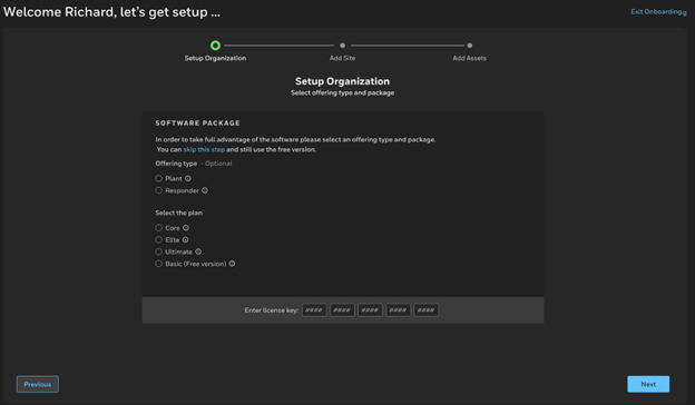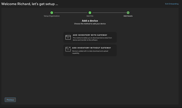 Follow the Onboarding Wizard to set up your organization, site, and devices. The wizard includes the following steps: